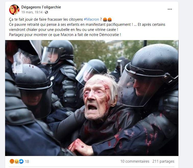 En 2023,c’est au moment des manifestations contre le projet de loi sur les retraites que c’était répandu sur la toile de fausses images sur les violences policières. Des policiers en tenue anti-émeute face à des manifestants âgés et ensanglantés a été diffusé avec des légendes suggestives, amplifiant la perception d’une répression brutale (ref: France 3 Régions Le Monde.fr Factuel). Même si cette image a été très vite démentie par des experts et alors que son créateur, Régis Gonzalez, artiste contemporain, précise qu’il s’agit d’une œuvre de satire intitulée « Fakumentary 2043 », le mal était est fait et le message bien ancré dans la tête des internautes.